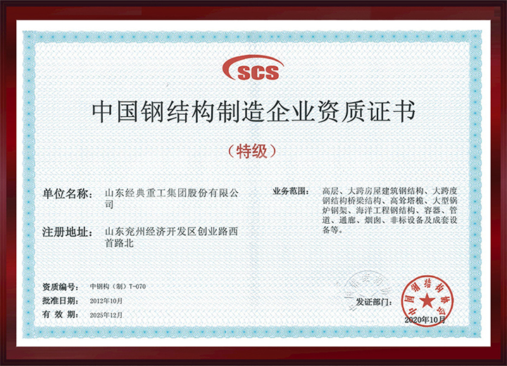 取得中國鋼結(jié)構(gòu)制造特級(jí)資質(zhì)。