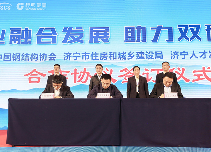 中國鋼結(jié)構(gòu)協(xié)會(huì)、濟(jì)寧市住房和城鄉(xiāng)建設(shè)局、濟(jì)寧人才發(fā)展集團(tuán)三方人才合作簽約儀式。