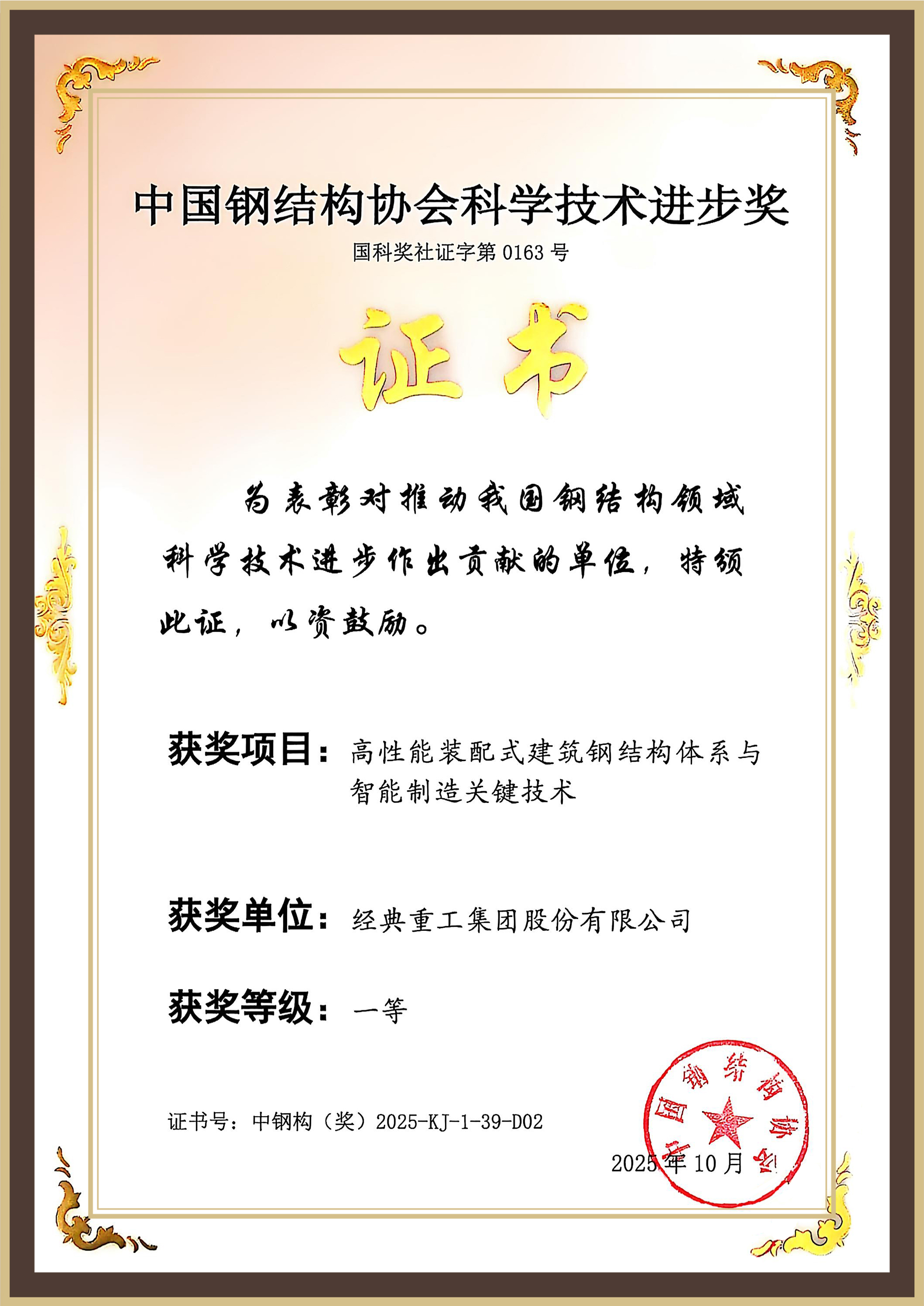 在科學(xué)技術(shù)獎(jiǎng)?lì)C獎(jiǎng)典禮上,經(jīng)典重工集團(tuán)股份有限公司作為主要科研單位參與的《高性能裝配式建筑鋼結(jié)構(gòu)體系與智能制造關(guān)鍵技術(shù)》項(xiàng)目榮獲中國鋼結(jié)構(gòu)協(xié)會(huì)科學(xué)技術(shù)進(jìn)步獎(jiǎng)一等獎(jiǎng)。